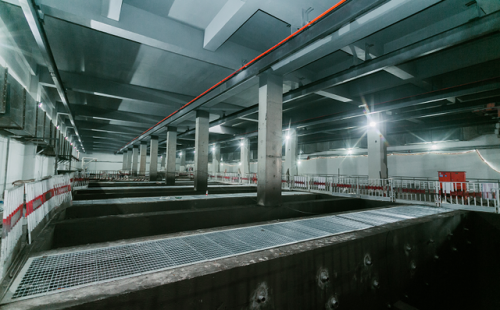 西安市第三污水處理廠并不只是簡單將地上的污水處理廠“下沉”,而是在充分考慮各類安全風險等因素后,重新統(tǒng)籌功能分區(qū),實現(xiàn)資源整合的最優(yōu)配置。項目采用分層布置形式,地下一層為操作層,為設(shè)備調(diào)控中心和人力檢修中心,地下二層為水處理構(gòu)筑物和綜合管廊,污水處理廠的曝氣池、沉淀池等在這里“一應俱全”。同時,項目團隊結(jié)合施工方案對地下空間進行多維度優(yōu)化,形成立體三維布置,通過優(yōu)化工藝流程、重組單元組團、修改構(gòu)筑物布局等方式,提升空間利用效率,將項目占地用地減少了三分之二。