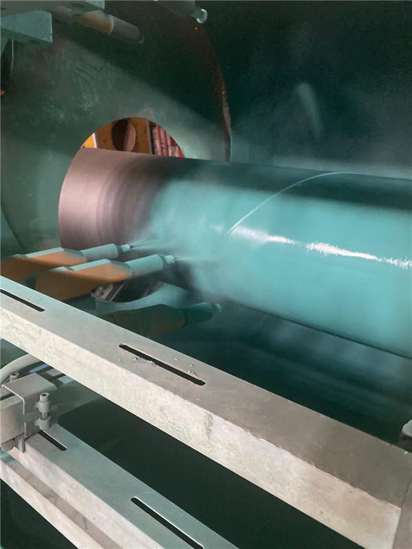 開始生產(chǎn)時,先用試驗管在生產(chǎn)線上分別依次調(diào)節(jié)預(yù)熱溫度及膠粘劑防腐層的厚度,聚乙烯層的包覆采用側(cè)向纏繞工藝,應(yīng)確保搭接部分的聚乙烯完全輥壓密實,并防止壓傷聚乙烯層表面,膠粘劑的涂敷采用側(cè)向纏繞工藝,且涂敷必須在環(huán)氧粉末膠化過程中進(jìn)行,以確保膠粘劑與環(huán)氧涂料能相互滲透,使其達(dá)到各項要求后方可開始生產(chǎn)。