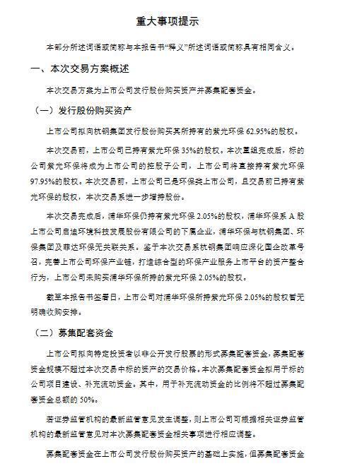 12月16日菲達環(huán)保公布發(fā)行股份購買資產(chǎn)并募集配套資金暨關(guān)聯(lián)交易報告書(草案),上市公司擬向公司控股股東杭鋼集團發(fā)行股份購買其所持有的紫光環(huán)保62.95%的股權(quán)。